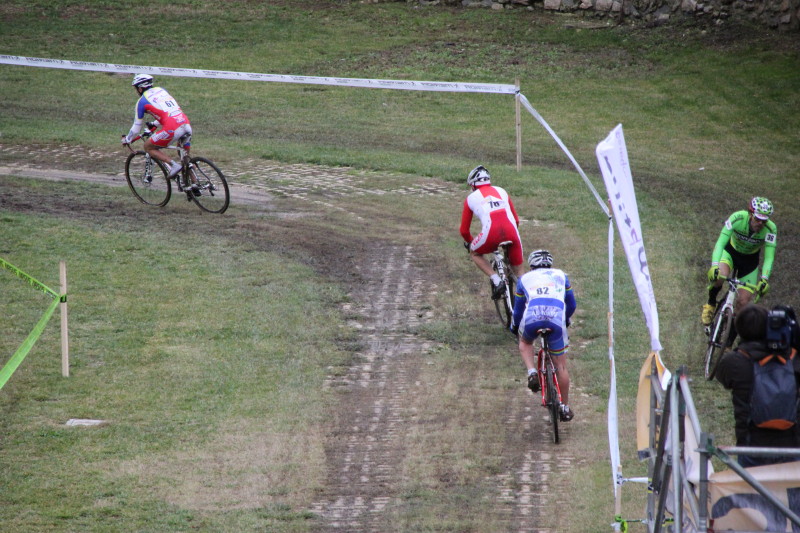 mais comme c'était prévisible, sur cette chaussée très glissante, dans le 1er virage, des chutes.... que j'ai évitée de justesse en posant le pied par terre... mais les premiers avaient déjà disparus... les inconvénients du cyclo cross avec les places à l'arrière... mais un seul coureur de ma catégorie juste devant moi, j'ai sauvé l'essentiel
